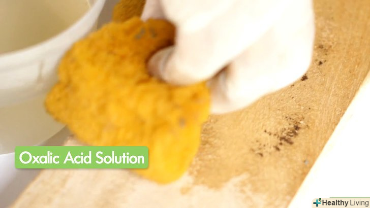 Протріть дерево приготованим розчином щавлевої кислоти. губкою нанесіть розчин на дерев'яну поверхню. Не шкодуйте розчину, щоб як слід відбілити дерево, і при необхідності змочуйте губку повторно. Нанесіть достатньо розчину, щоб дерево як слід просочилося їм. [17]