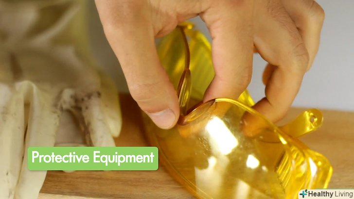 Одягніть захисний одяг. відбілювач може завдати шкоди, якщо потрапить на шкіру або в очі. Перш ніж наносити відбілювач, надіньте захисні окуляри і товсті рукавички. [2]- Відбілювач може знебарвити тканину, тому при роботі з ним краще надіти старий одяг.