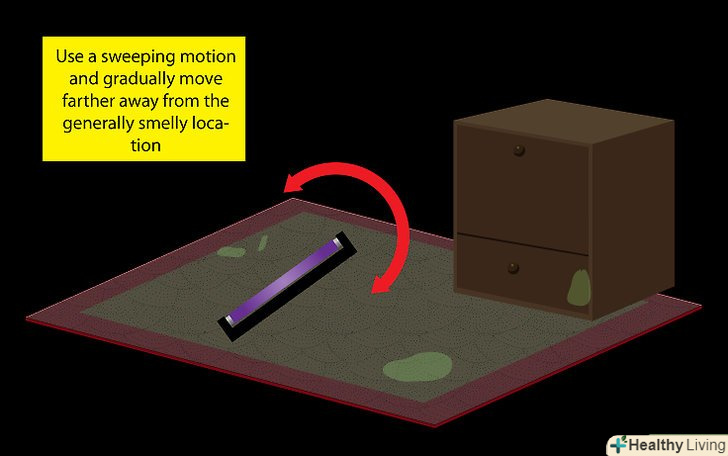 Використовуйте розмашисті рухи і поступово рухайтеся від місця, яке зазвичай смердить. тваринна сеча, яку ви шукайте, повинна бути жовтого або зеленуватого кольору. Ви можете бути здивовані, якщо знайдете плями і в інших місцях, а не в тому, на яке ви думали. Перевіряйте не тільки стать, тому що коти дуже винахідливі! Перевірте такі ділянки:- Книжкові полиці