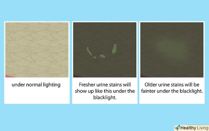 Погляньте на ці приклади, щоб зрозуміти, що потрібно шукати. на першому зображенні показано, як виглядає заплямований килим при нормальному освітленні. На другому зображенні ви бачите, як виглядають свіжі плями під флуоресцентною чорною лампою. На третьому зображенні видно, що старі плями сечі помітні слабкіше, ніж свіжі, під флуоресцентної чорною лампою.