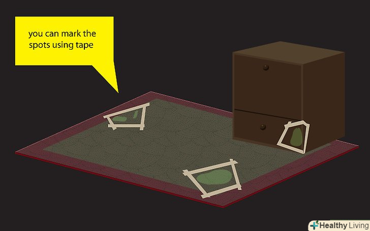 Очистіть килим, коли ви знайдете плями. по можливості очистіть килим відразу ж, як тільки знайдете плями. Можна позначити забруднені ділянки, використовуючи клейку стрічку, а потім відмити їх.