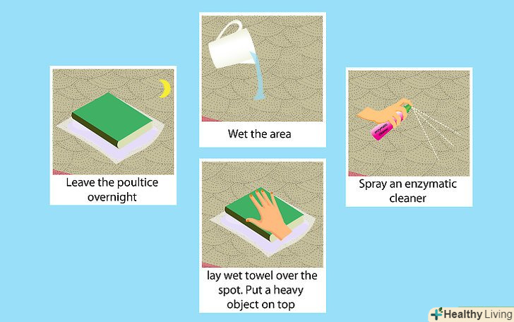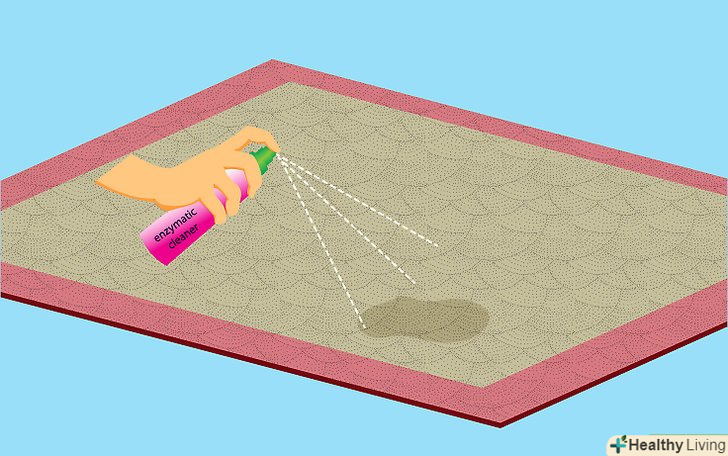- Розпиліть ферментний очищувач на вологому ділянці. Дотримуючись інструкцій, залиште дану речовину на кілька годин, поки проблема не буде усунена. Якщо у вас вовняний килим, використовуйте засіб, призначений для вовни.