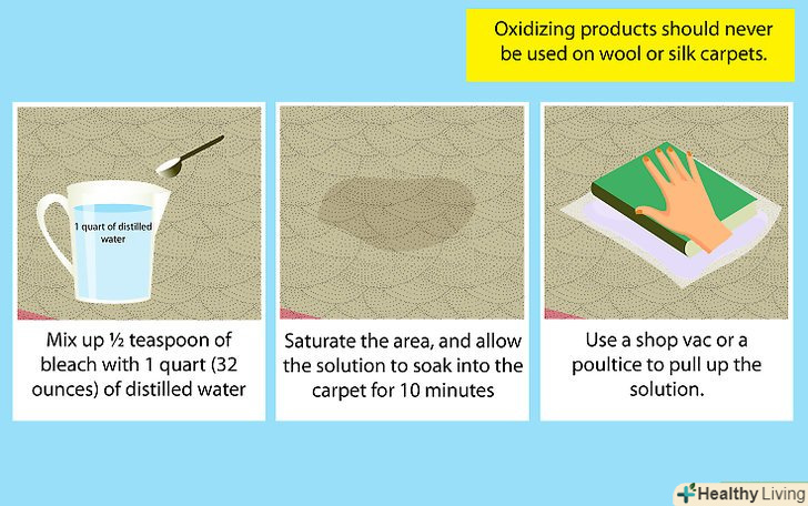 Використовуйте оксидування (необов'язково). для видалення старих плям замість пароочисника можна використовувати оксидування. Речовини, що виділяють кисень, дуже ефективні для усунення запаху. Даний розчин ви можете зробити самостійно в домашніх умовах.- Ніколи не використовуйте окислювальні речовини на вовняних або шовкових килимах. Дана обробка підходить тільки для синтетичних тканин.