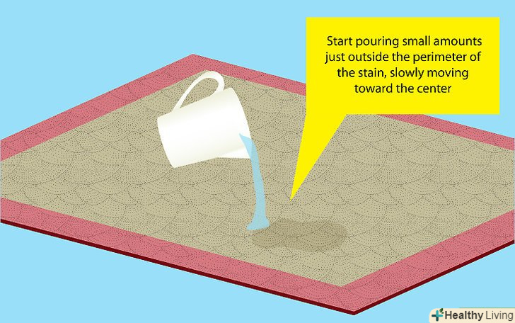 Повторно зволожите ділянку. після того, як Ви прибрали примочку, знову полийте ділянку холодною водою. Починайте поливати за периметром плями, повільно пересуваючись до його центру. (Так сеча не розтечеться в ще більшу пляму). Нехай вода просочить пляму протягом хвилини.