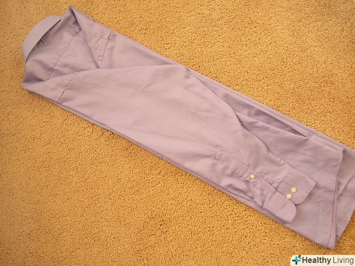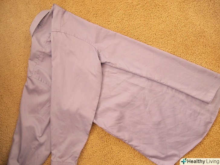 Складіть спочатку праву частину. складіть приблизно одну третину сорочки, у напрямку до її центру. Лінія згину починається від середини плеча і закінчується в нижній частині. Ви будете бачити задню сторону сорочки і, приблизно, одну третину передньої сторони, складеної назад.