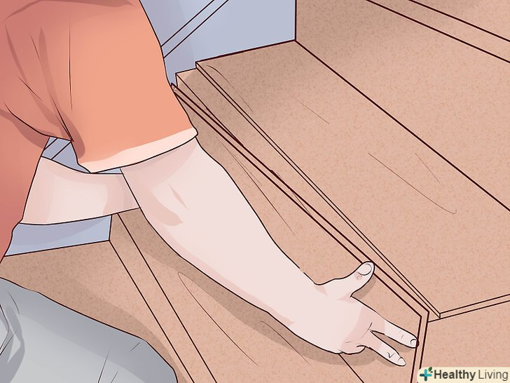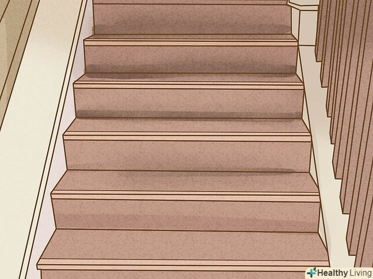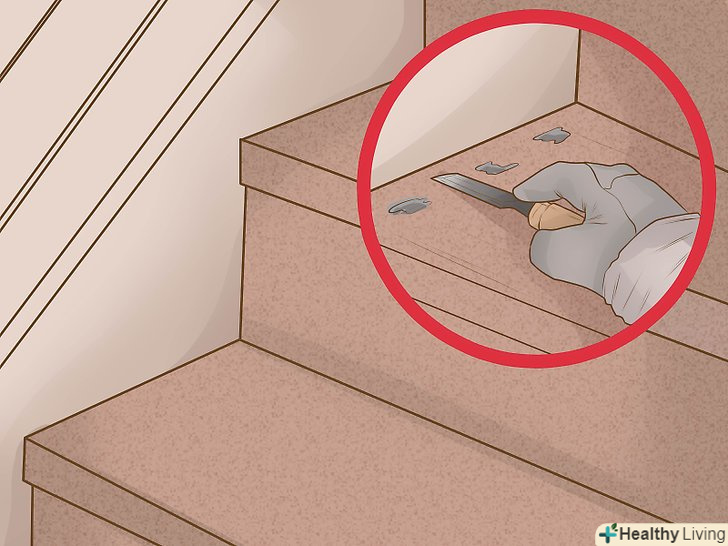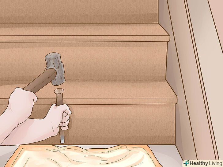 - Навіть якщо ваша сходи не має килимового покриття, вам потрібно підготувати її. Видаліть стару фарбу і відремонтуйте всі скрипучі і зламані сходинки шляхом прибивання їх надійно до місця. [5]