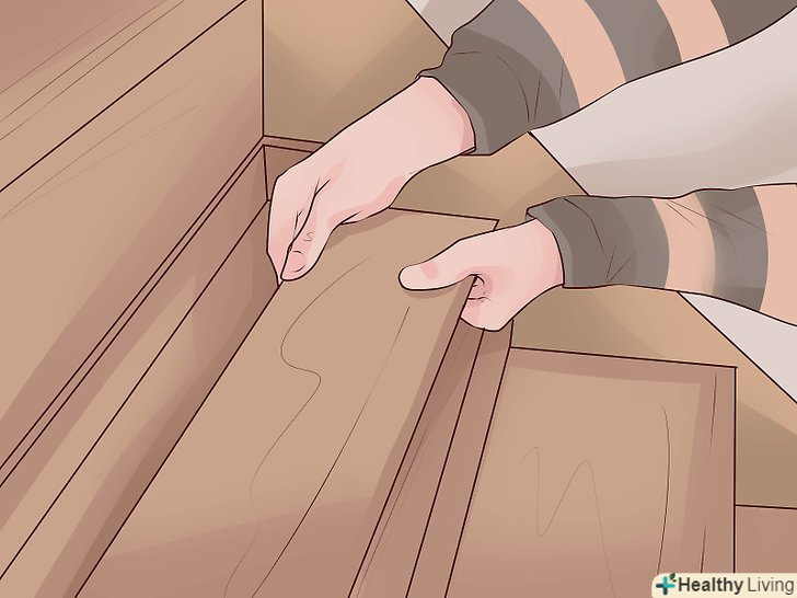 Поставте подступенки на місце. наступний крок-поставити подступенки, які є вертикальними частинами сходів. Налийте три краплі столярного клею до задньої частини сходинок (які ви, відповідно, відріжете заздалегідь) і притисніть їх до місця, міцно притримуючи хвилину або дві, щоб клей вбрався. Ця частина повинна щільно сидіти між сходинкою внизу і сходинкою вище.- Якщо ви хочете закріпити подступенок вище, то ви можете використовувати гвоздезабівной пістолет, прикріплюючи верх планки до місця так, щоб цвяхи не були видні по краях.