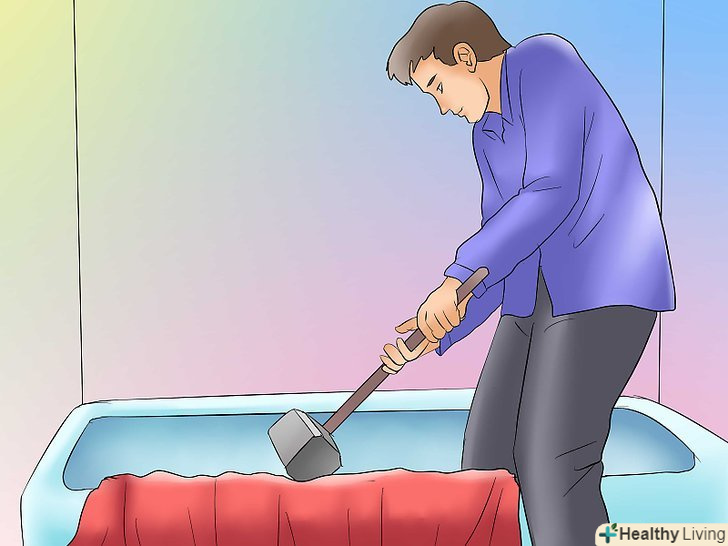 Накрийте ванну старим мокрим ковдрою або рушником, щоб запобігти розлітання осколків чавуну і емалі, потім візьміть кувалду і вдарте по борту ванни щосили, в точку приблизно на висоті однієї третини від підлоги, з того боку, де знаходиться зливний отвір. ваше завдання - вибити шматок ванни побільше. Чавун досить крихкий, розбити його буде набагато простіше, ніж здається. Проте, побільше сил і кувалду вам знадобляться.