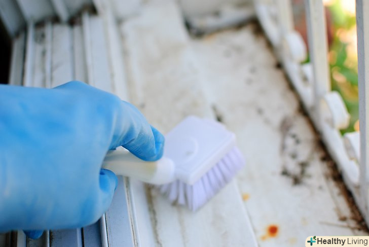 Зітріть цвіль. зітріть більшу частину цвілі за допомогою мила (або миючого засобу), води та щітки. Гарне тертя в комбінації з мильним розчином є дуже ефективним способом видалення цвілі. Слід зазначити, що замість мила або миючого засобу можна використовувати розчин оцту, так як він є легким поверхнево-активною речовиною.