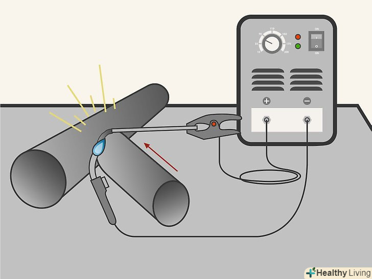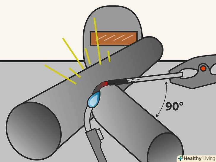 Починайте вести зварений шов. Тримайте електрод під кутом трохи менше 90°. Не ведіть занадто швидко. Як основний принцип-на кожен сантиметр шва використовуйте сантиметр електрода. Коли ви ведете калюжу розплавленого металу, то можете це робити по прямій лінії або вести електрод маленькими колами.- Важливо підтримувати постійну довжину дуги або відстань від кінчика електрода до металу. Спочатку це може бути складно, так як електрод постійно вигорає.