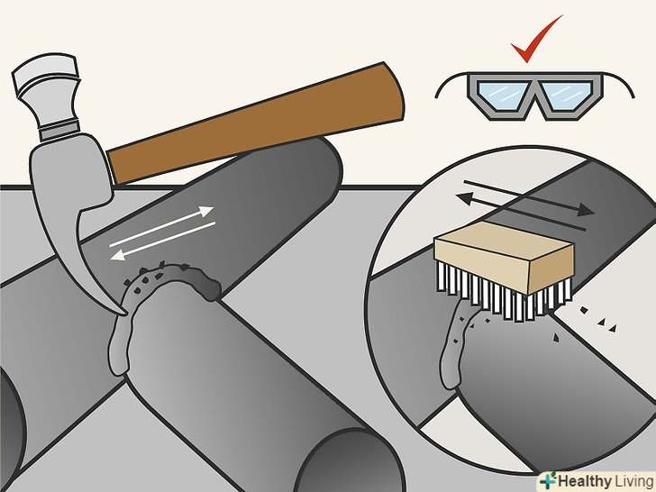 Зачистите окалину. Окалина-це залишки, що утворюються в процесі зварювання. Під час зварювання окалина захищає гарячий метал від домішок. Окалина не остигає з тією ж швидкістю як і зварений шов і це дозволяє окалині відскакувати від зварювання. Використовуйте молоток для того щоб відбити окалину зі шва.- Треба одягати захисні окуляри на час зварювання так що коли щиток піднімається очі залишаються захищеними.