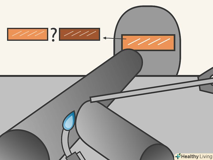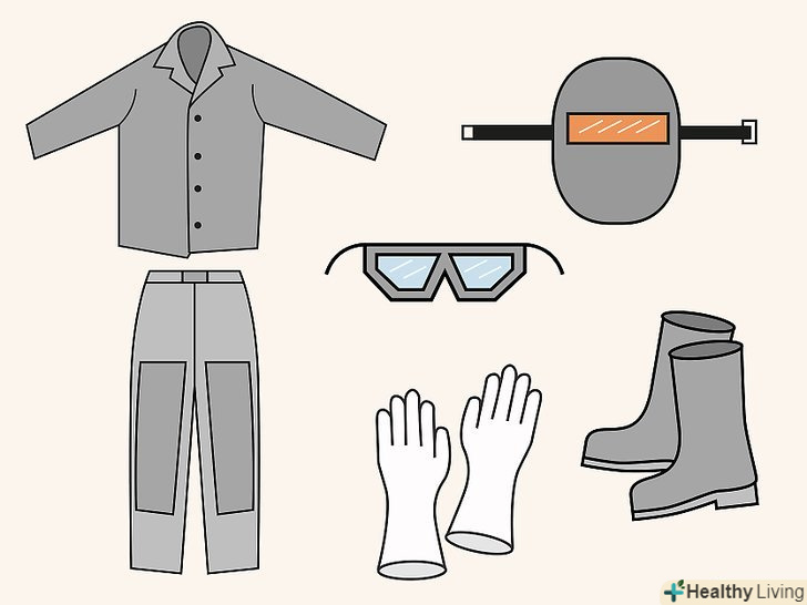 Одягніть захисний одяг. вона включає маску зварника (номер стекла10 або вище), куртку зварника або толстовку з бавовни, штани без клапанів, робочі черевики і захисні окуляри.- Не одягайте тенісне взуття, пошарпаний одяг, штани з клапанами, футболки, Сорочки з відкритими кишенями або сорочки без рукавів.