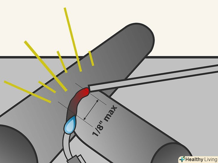 Запаліть зварювальну дугу. це досягається легким ударом по металу і швидким підняттям електрода або цвірканням як сірником. Ви замикаєте ланцюг і розриваєте її, при цьому Електрика зривається з електрода на метал.- Більшість сучасних масок дозволяють бачити і до моменту запалювання дуги і потім автоматично затемнюються для захисту очей від випромінювання. У масках старіше або дешевше коштують просто затемнені лінзи через які не видно до того як не пішов процес зварювання. В цьому випадку вам треба знайти місце початку зварювання, опустити маску і потім запалювати дугу.
