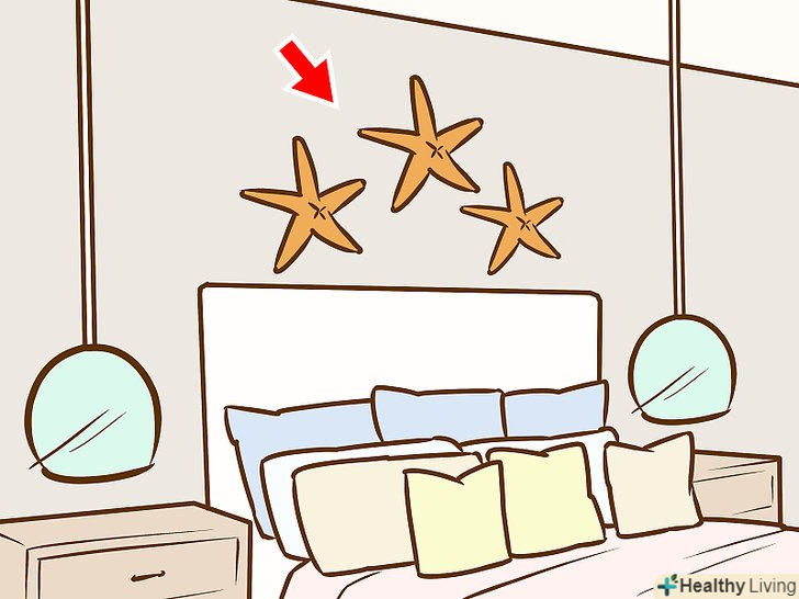 Виберіть єдину тему для оформлення кімнати. якщо ви вирішили скористатися темою морського пляжу, місцями розкладіть в кімнаті морські черепашки. Їх можна купити в магазині або самостійно відправитися на морське узбережжя і безкоштовно зібрати там відповідні черепашки, корчі тощо.- Повісьте кілька предметів художнього мистецтва. виберіть такі картини, які будуть відображати ваші інтереси і характер. Простежте за тим, щоб кольори картин поєднувалися з квітами оформлення кімнати.