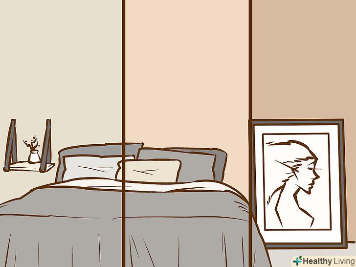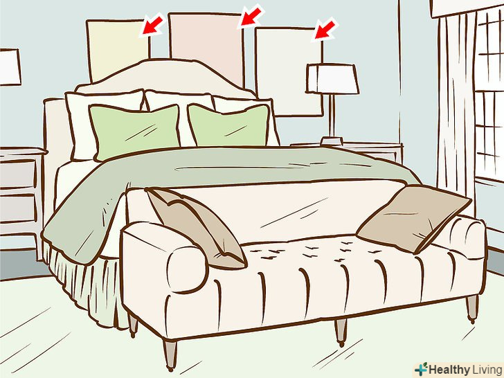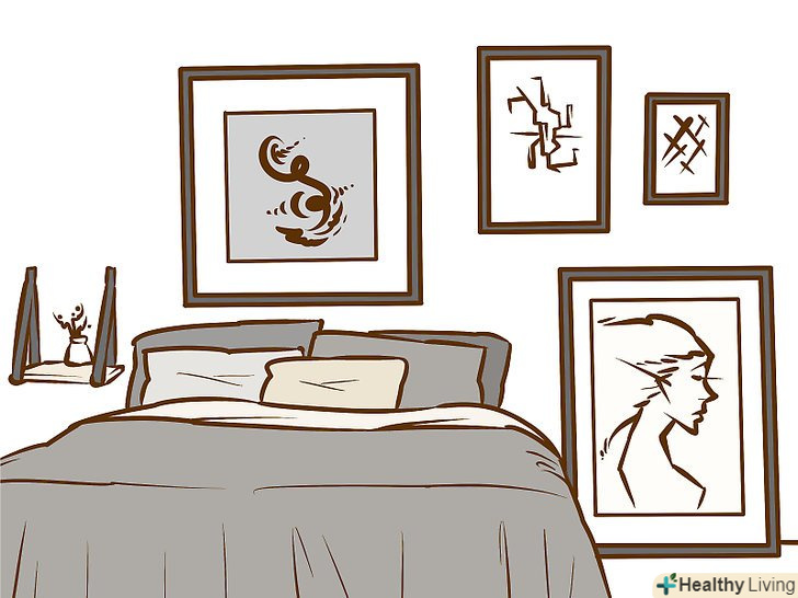 Пофарбуйте кімнату в нейтральний колір, наприклад в Бежевий, Світло-коричневий або в білий. Темно-синій також можна віднести до заспокійливих кольорів, які можна використовувати для спальні. З таким оформленням стін ви зможете повісити на них більше картин і фотографій. При цьому вам не доведеться переживати, поєднуються вони зі стінами чи ні. Світлі нейтральні кольори візуально збільшують кімнату. Якщо ж пофарбувати стіни в дуже темний колір, наприклад чорний або фіолетовий, приміщення буде здаватися маленьким і тісним.- Обміркуйте ідею пофарбувати стіну за узголів'ям ліжка в соковитий колір. Тим самим ви акцентуєте увагу на ліжку, зробивши її ключовим елементом кімнати. Від цього ваша спальня буде здаватися затишніше.