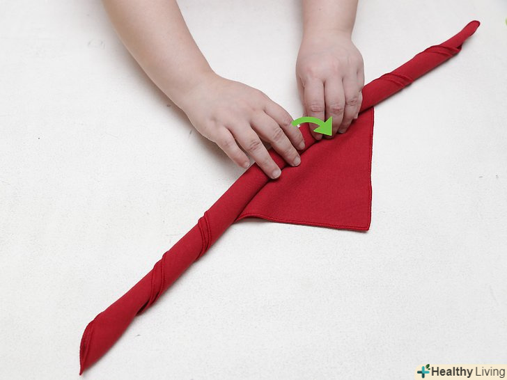 Почніть закручувати серветку з підстави трикутника. візьміть довгу широку частину серветки і закручуйте її трубочкою до кінця. Закручуйте максимально щільно. Чим щільніше ви її скрутіть, чим легше буде зберегти її кінцеву форму, тому, чим щільніше – тим краще.- Коли ви закінчите, ваша серветка повинна нагадувати вузьку тонку трубочку. Краї серветки повинні повторювати діагональні лінії на поверхні трубочки.