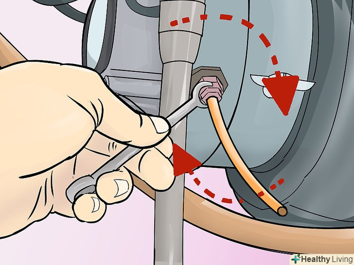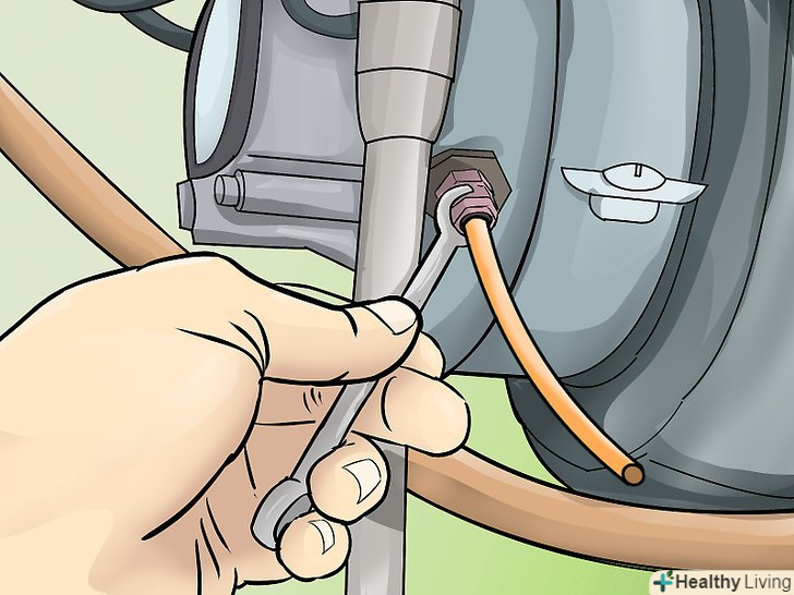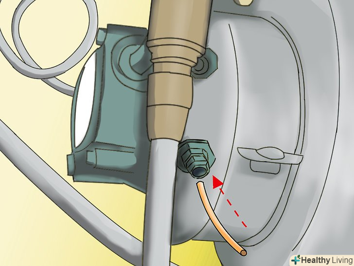 Прикріпіть до випускного клапана ¼ нейлонової трубки. Трубка повинна бути досить довгою, щоб дістати до дна контейнера, розміщеного поблизу. Підійде пляшка об'ємом 1 л, як правило, її розміру достатньо для більшості систем. Цей контейнер буде використовуватися для збору палива при продувці в наступному кроці. Трубка прикріплюється до випускного клапана, підготуйте його, послабивши за допомогою гайкового ключа. Поворот проти годинникової стрілки послаблює його, аналогічно з болтом і гайкою. Потім знову злегка закріпіть. В ході цього процесу ви можете почути булькання повітря з трубки-це хороший знак.
