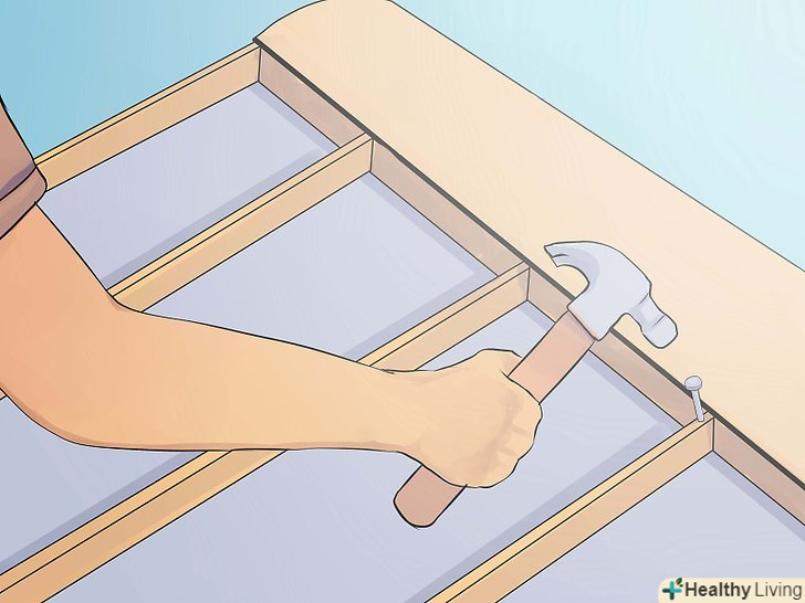 - Закріпіть підкладку. Розмотуйте відрізки довжиною 3 метри за один раз і закріплюйте їх цвяхами на відстані 60 см один від одного. Цвяхи повинні знаходитися не ближче, ніж в 5 см від краю даху.