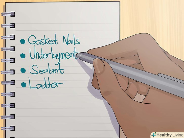 Складіть список необхідних інструментів і матеріалів. деякі з них знайдуться в будь-якому господарстві (наприклад, сходи), тоді як інші мають досить вузьку область застосування. Наприклад:- Покрівельні цвяхи - це такі цвяхи, які мають зовнішній пластиковий ковпачок, який покликаний перекрити отвори від цвяхів і запобігти текти. [4]