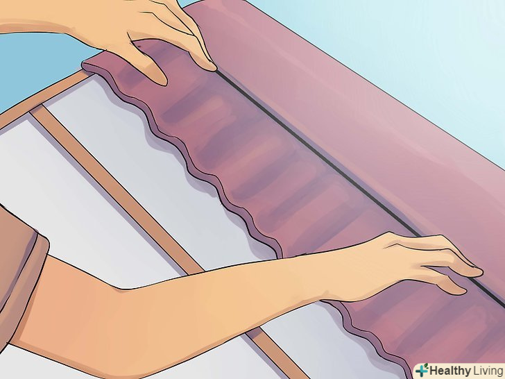 Укладання черепиці. починайте з одного боку і рухайтеся по довжині даху.- Якщо ви не встановлювали батенси, то черепицю можна прибивати прямо до обшивки.