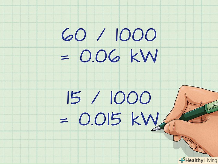 Розділіть це число на тисячу. так ви перетворите вати в кіловати. Найпростіший спосіб поділу на тисячу-перемістити десяткову кому на три знаки вліво.- Приклад 1: типова Лампа розжарювання споживає 60 ват (Вт) енергії або 60/1000 = 0,06 кВт.