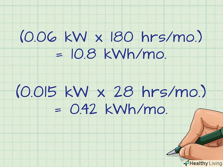 Помножте споживане число кіловат на кількість годин. Ваша енергокомпанія нараховує плату за кожну «кіловат-годину» (кВт ∙ год), або кожен кіловат енергії, споживаної протягом однієї години. Щоб обчислити, скільки кіловат-годин на місяць споживає ваша лампочка, помножте кількість кіловат на кількість годин, яке вона працює щомісяця.- Приклад 1: Лампа розжарювання споживає 0,06 кВт енергії 180 годин на місяць. Її енерговитрати становлять (0,06 кВт * 180 годин/місяць) = 10,8 кіловат-годин на місяць.