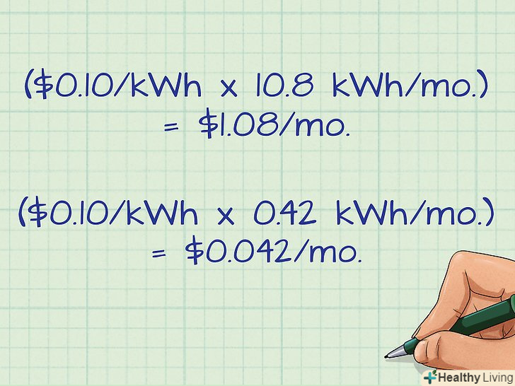 Розрахуйте витрати на роботу лампочки. дізнайтеся вартість кожної кіловат-години електроенергії в рахунку за електрику. Помножте це значення на кількість кВт∙год, які ваша лампочка споживає щомісяця, щоб визначити, скільки ви платите за роботу цієї лампочки.- Приклад 1: ваша енергокомпанія нараховує 5,38 рублів за кожну кіловат-годину. Лампа розжарювання споживає 10,8 кВт ∙ год/місяць, так що обходиться вона вам в (5,38/кВт·год * 10,8 кВт ∙ год/місяць) = 58,104 рублів на місяць.