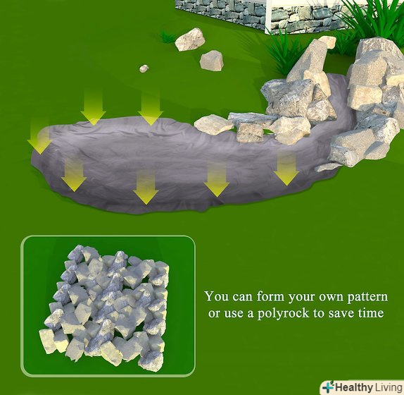 Покладіть кілька каменів на пластикову мембрану, щоб закріпити її на своєму місці. потім можете приступати до будівництва свого водоспаду.- Ви також можете купити поліуретанові панелі з обробкою каменем, щоб заощадити час.