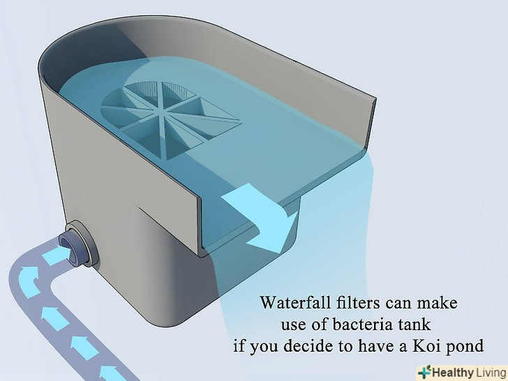 Якщо ви вирішите також зробити ставок для рибок Коі, то в цей момент найкраще встановити ємність для бактерій, щоб підтримувати життєдіяльність рибок.- Ємність для бактерій також служить резервуаром водоспаду, де насос може переганяти воду. Зверніть увагу на те, як встановлюються камені на місце за допомогою спеціального клейкої речовини для ставка. Це дуже надійно утримує камені на місці.