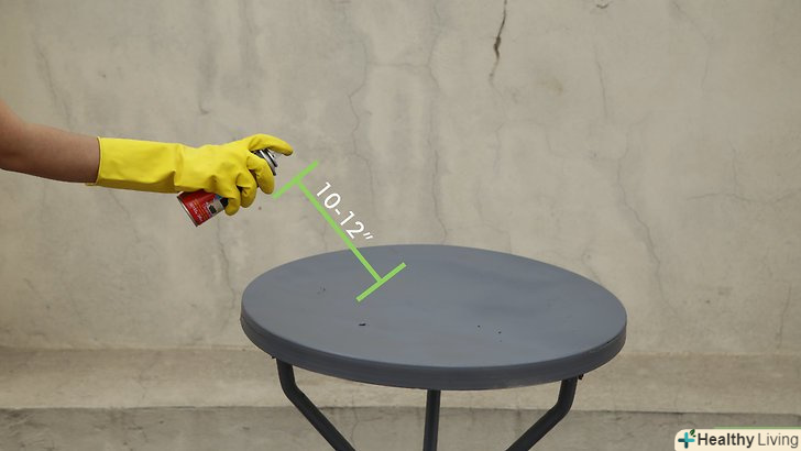 Тримайте балончик приблизно в 25-30 см від поверхні металу. якщо піднести балончик занадто близько, на поверхні почнуть утворюватися краплі і патьоки. А якщо встати занадто далеко, то це призведе до нерівномірного розпорошення фарби. Утримуючи балончик на відстані 25-30 см, розпорошите фарбу максимально рівним і гладким шаром. [13]- Наносите фарбу плавними рухами зверху вниз або з боку в бік. нанесіть тонкі шари фарби, щоб уникнути патьоків. Постарайтеся наносити фарбу рівномірно, оскільки більш товсті шари будуть довше сохнути. Розпилюйте фарбу, перекриваючи попередні краї, поки фарба не стане виглядати рівною і насиченою. [14]