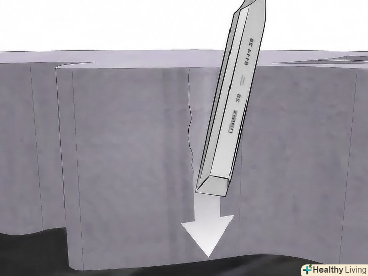 - Продовжуйте працювати зубилом до тих пір, поки не зробите канавку уздовж всієї наміченої лінії розрізу. При цьому ставте зубило на лінію і з силою ударяйте по ньому молотком один раз, потім переміщайте його вперед або назад уздовж лінії і знову ударяйте, і так далі.