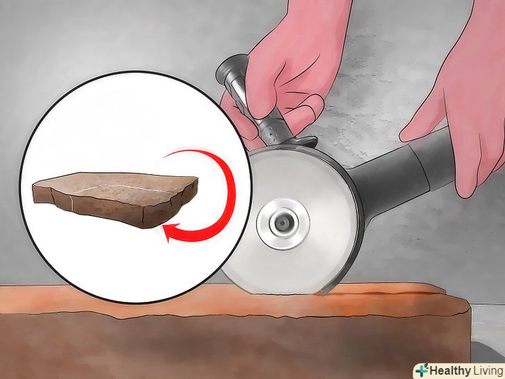 За допомогою шліфувальної машини виріжте лінії на інших сторонах каменю. розгорніть камінь так, щоб зверху виявилася одна з нелицьових сторін. [5]- Виріжте шліфувальною машиною пряму лінію на даній стороні. Пройдіться уздовж лінії кілька разів, поки не вийде вузька канавка. Не поспішайте і стежте за тим, щоб лінія була рівною.