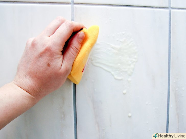 Напиліть на плитку спеціалізоване засіб для чищення. часто покупне засіб для чищення ванної або плитки є найбільш простим способом позбутися від мильного осаду, так як воно спеціально призначене для того, щоб видаляти стійкий наліт. Нанесіть миючий засіб на брудну плитку щедрим шаром відповідно до доданих інструкцій. [1]- Як правило, миючі засоби для ванних кімнат і плитки мають два види: рідкий і пінний спрей. Рідкий спрей ефективний для горизонтальних поверхонь-в цьому випадку не потрібно турбуватися, що він стече. Пінний спрей краще підходить для вертикальних стін, так як він залишається на місці і не стікає.