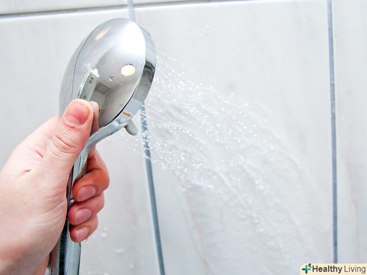Вимийте плитку теплою водою. після того як ви витрете губкою весь мильний наліт і залишки миючого засобу, заповніть пляшку з розпилювачем теплою водою. Обприскуйте плитку водою до тих пір, поки її поверхня не стане чистою. [4]- Якщо у вас немає пляшки з розпилювачем, можна змочити ганчірку теплою водою і протерти плитку.