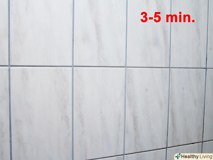 Зачекайте кілька хвилин після того, як завдасте засіб. Після того як ви завдасте засіб для чищення на всю поверхню плитки, слід почекати близько 3-5 хвилин. За цей час засіб проникне в мильний наліт, і вам легше буде очистити поверхню. [2]- Деякі миючі засоби необхідно залишати довше, ніж на 5 хвилин. Загляньте в прикладені інструкції, щоб дізнатися точний час.