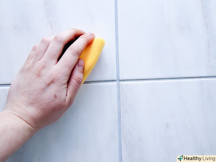 Змочіть губку і витріть плитку. після закінчення декількох хвилин потримайте губку під струменем теплої води. Акуратно витріть вологою губкою плитку і видаліть мильний наліт і залишки миючого засобу. [3]- Використовуйте неабразивну губку, щоб не подряпати плитку. При бажанні можна взяти замість губки вологу ганчірку.