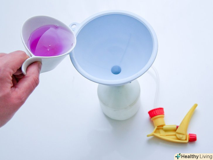 Залийте оцет і засіб для миття посуду в пляшку з розпилювачем і струсіть її, щоб вони перемішалися. після того як оцет нагріється, перелийте його в пляшку з розпилювачем. Додайте таку ж кількість мила для посуду і закрийте пляшку кришкою. Як слід потрусіть пляшку, щоб інгредієнти перемішалися. [8]- Перевірте приготований розчин. Якщо він виявився занадто густим і погано розпорошується, можна долити трохи теплої дистильованої води, щоб розбавити його.