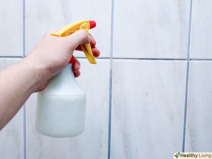 Розпиліть розчин на плитку і почекайте деякий час. коли ви будете готові використовувати миючий засіб, щедро розпиліть його на забруднену плитку. Після цього почекайте хоча б 30 хвилин, щоб розчин просочив мильний наліт. [9]- Якщо на плитці утворився дуже товстий шар мильного нальоту, можна залишити розчин на ній на одну годину або довше.