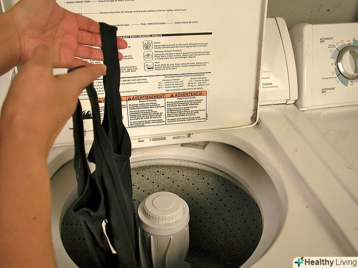 Виверніть леотард навиворіт. це абсолютно необхідно при митті леотарда в машинці, і також це продовжить термін служби тканини і будь-якої обробки, скорочуючи прямий знос. Металеві або інші спеціальні обробки зносяться дуже швидко, якщо мити леотард лицьовою стороною в машинці або вручну.