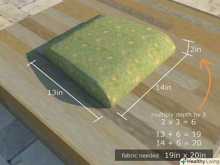Виміряйте ширину, довжину і глибину сидіння. якщо сидіння закруглене або зігнуте, виміряйте його найбільшу довжину і ширину. Глибина повинна бути в три рази більше довжини і ширини, і цей розмір тканини вам знадобиться для одного місця. Наприклад,якщо сидіння 10"х12"х2"(25х30, 5х5 см), то вам знадобиться шматок тканини з розмірами 16"х18"(40.5х46 см).