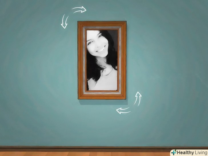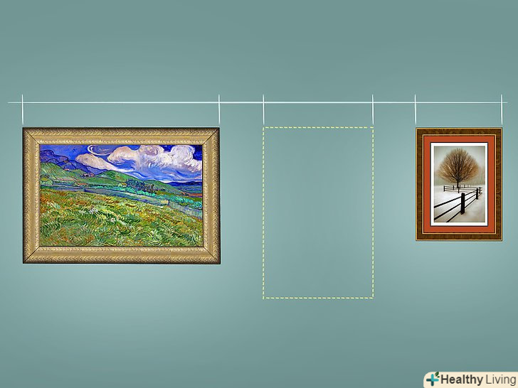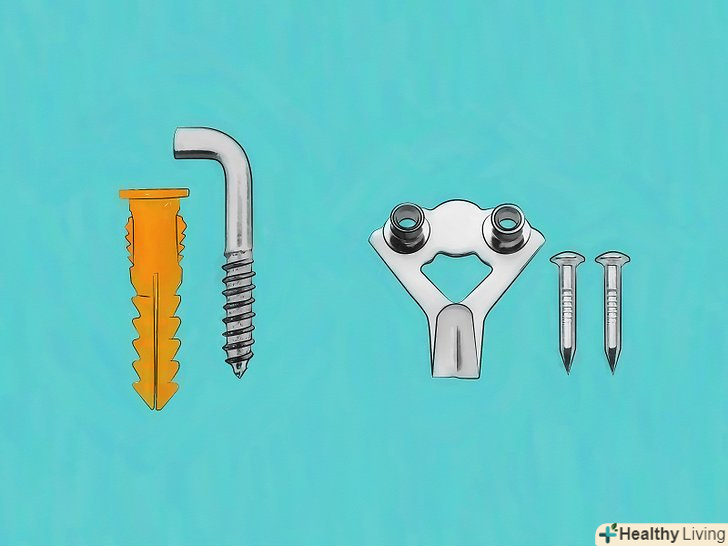 Виберіть кріплення. Якщо ви будете вішати картину на стійці каркаса стіни, вам знадобиться гвинт з круглою капелюшком, який називається анкерним гвинтом. Невеликий оздоблювальний цвях, довжиною від 3,5 до 5 см, що витримує вагу в кілька кілограмів навіть без дерев'яної балки, прекрасно підійде для легких картин, проте Анкерний гвинт - найбільш безпечний варіант. Є безліч інших варіантів для кріплення невеликих фотографій, доступних в будь-якому господарському магазині. Серед них: різні гачки, двосторонній скотч і більш складні пристрої, такі як система фіксації картин.