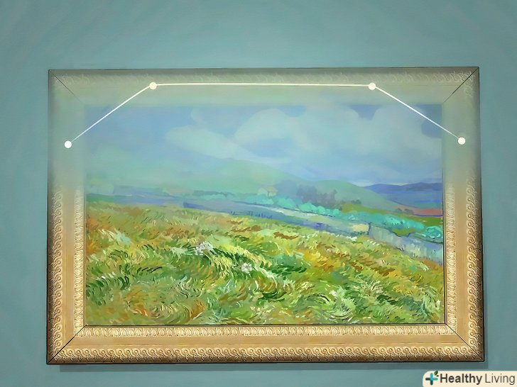 Визначте, де буде висіти картина. розташуйте картину так, щоб її центр знаходився точно навпроти позначки, зробленої вами олівцем на стіні, і подивіться, чи сподобається вам таке розташування. Якщо вам здається, що картину потрібно підняти або опустити, зробіть це. Після того, як ви остаточно визначилися, виміряйте відстань від центру картини до її верхнього краю і відзначте висоту. Потім виміряйте відстань від верхнього краю картини до місця розташування кронштейна або підвісного дроту на зворотному боці рамки. Відніміть цю відстань з відстані висоти рамки, щоб визначити, де на стіні треба встановити Анкерний гвинт, щоб центр картини знаходився на бажаній висоті.- Якщо картина кріпиться на підвісну дріт, натягніть її перед вимірами, так як саме в такому стані вона буде перебувати, коли ви повісите картину на стіну.