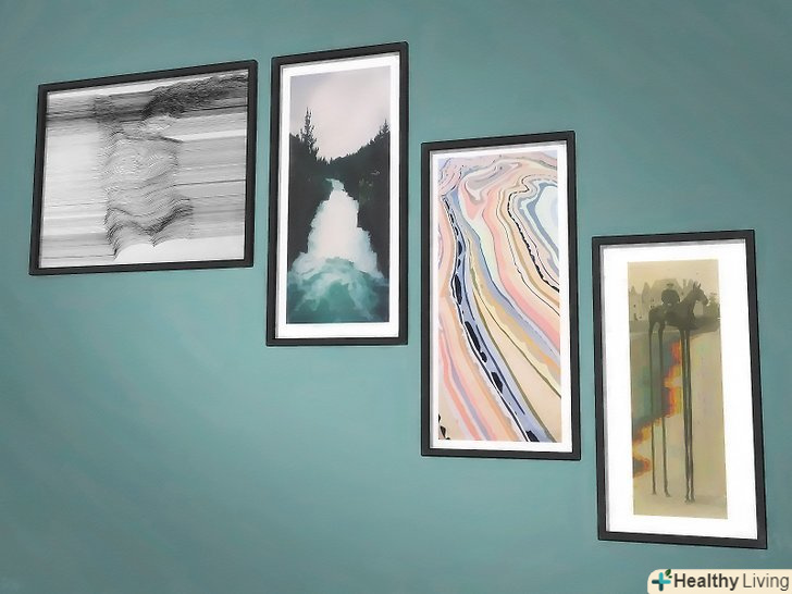 Розташуйте макети креативно. Три картини однакового розміру, що висять в ряд, створюють ефект руху; шість або сім картин різних розмірів можна розташувати на різній висоті, щоб візуально збільшити простір кімнати. Не бійтеся експериментувати з розташуванням картин. Шукайте оригінальні варіанти. Не розміщуйте картини занадто високо або занадто низько, щоб не було відчуття, що вони висять не на своєму місці.- Продумайте всі деталі. Кілька маленьких картин не створять вигляду, якщо будуть висіти окремо в трьох різних кімнатах, проте вони будуть мати гарний вигляд на невисоких стінах або поруч один з одним. Фотографії альбомного формату дають більше можливостей для їх розміщення, чого не скажеш про портретному оформленні картин. Покладіться на свою інтуїцію і експериментуйте, поки не знайдете найкращий спосіб експозиції своїх картин.