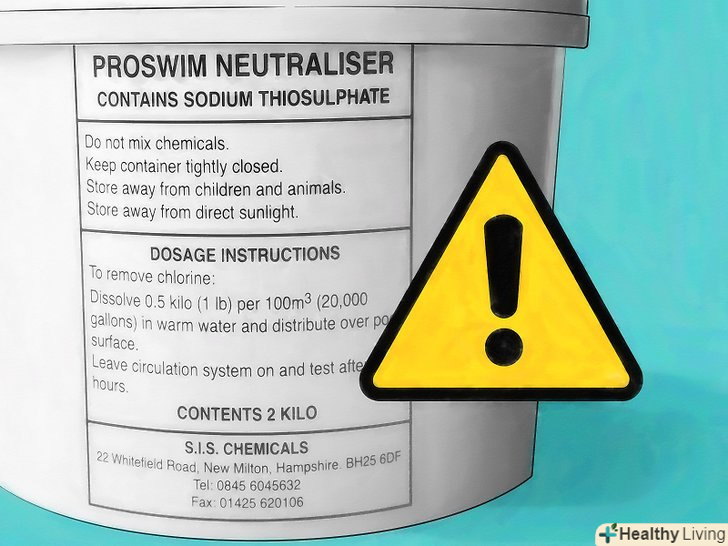 Дотримуйтесь запобіжних заходів. при контакті з легенями, очима або шкірою з багато хімічних речовин для басейнів можуть завдати певної шкоди. Перш ніж продовжити, ознайомтеся з цим переліком запобіжних заходів: [16]- Уважно прочитайте на етикетці інструкцію із застосування. Дотримуйтесь всіх рекомендацій щодо застосування і ознайомтеся з ходом дій в разі непередбаченого випадку.