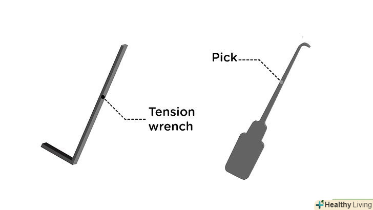 Купіть набір відмичок (гачок і натягувач). кожна відмичка служить своєї мети. Натягувач використовується для створення тиску на циліндр при повороті. Відмички і натяжители професійного класу можна придбати в наборі (див.ілюстрацію), але багато людей, для яких розтин замків - це хобі, роблять якісні відмички самостійно. Зверніться нижче до секції "що вам знадобиться" за інформацією про те, як зробити відмички і натягувачі самостійно.- Помістіть натягувач в нижню частину замкової щілини.