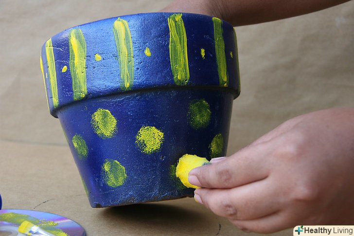 Додайте візерунки (за бажанням). Наносите їх, вмочуючи губку в емаль контрастних кольорів. Можна вирізати з губки фігурки (квадрати, зірочки, гуртки) або використовувати її, щоб фарбувати легкими мазками. Порізавши губку на вузькі смуги, можна нанести на горщик горизонтальні або вертикальні смужки.