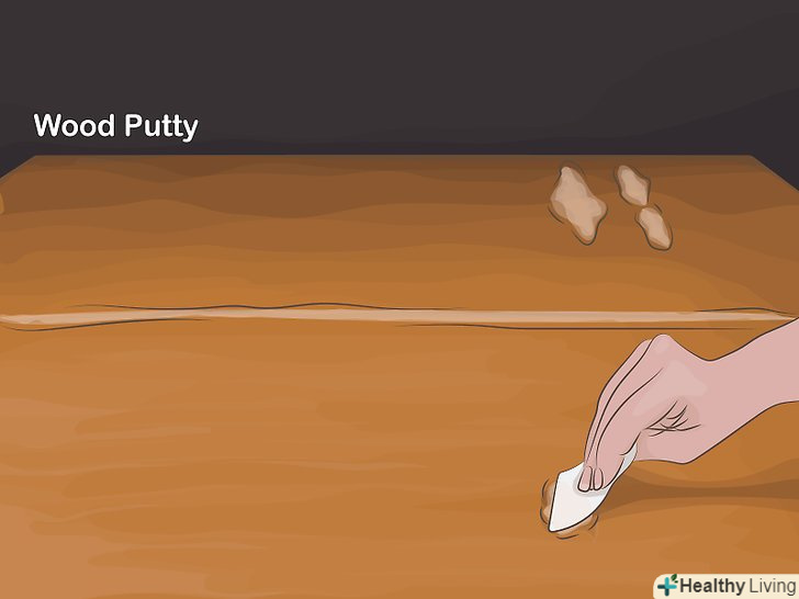 Заповніть щілини і нерівності поверхні замазкою по дереву за допомогою шпателя. Замазка по дереву являє собою кремоподібну пасту, яка легко заповнює собою будь-які нерівності деревини. Щоб скористатися цим засобом, підчепити невеликим шпателем трохи замазки і розподіліть її рівним шаром по тріщині або виїмці в деревині, надаючи при цьому рівномірний тиск на шпатель. Потім візьміть шпатель побільше (в порівнянні з розмірами вади на поверхні деревини) і розподіліть замазку навколо області вади, щоб остаточно вирівняти поверхню. Виконайте ці дії для всіх помітних вад поверхні. [2]- Вирівнювання поверхні деревини дозволяє забезпечити рівне і безпроблемне подальше нанесення фарби.