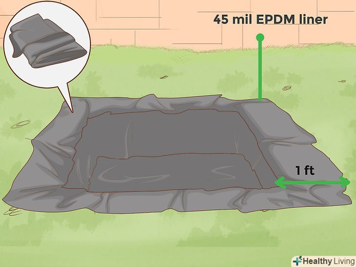 Як вибрати облицювання? не можна зробити хороший ставок без хорошого облицювання, оскільки вона є шкірою і одним з ключових компонентів вашого водойми. В ідеалі облицювання повинна прослужити 20 років. Найкращим і довговічним матеріалом для облицювання є каучук на основі сополімеру етилену, пропілену і дієнового мономеру на 45 Міл.- Як правильно виміряти облицювання – за допомогою мотузки, поклавши один її кінець в 45 см від краю ставка в місці максимальної висоти води. Прокладіть мотузку в найширшій частині котловану, щоб вона повторювала всі вигини поверхні, потім додайте 45 см з протилежного краю. Тепер виміряйте довжину мотузки. Повторіть цю ж процедуру по довжині ставка. Під облицюванням необхідно влаштувати підстильний шар.