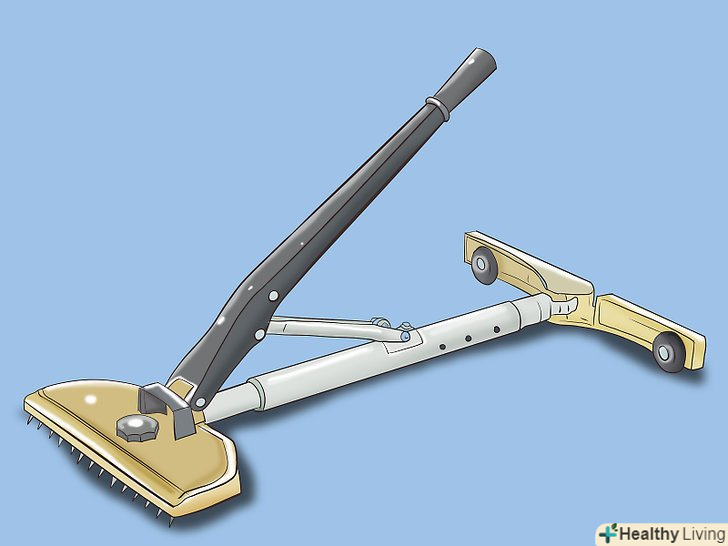 Для завершення роботи вам знадобляться деякі інструменти: підрамник, кікер і різак для килима (купуйте або краще орендуйте на кілька годин ці інструменти відразу ж після прикріплення нових смуг, це заощадить вам час).- «Закусіть» килим гострими зубцями на одному кінці, а на протилежній поставте дужки. Таким чином, ви зможете розтягнути килим у найбільших кімнатах. Можна придбати додаткові інструменти, щоб розрахувати довжину кімнати для розтягування.