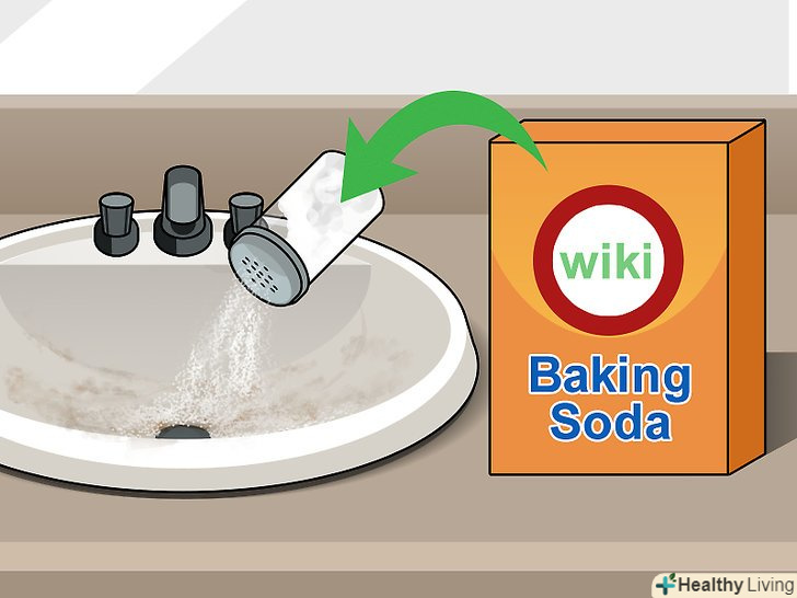 Нанесіть харчову соду на забруднену ділянку за допомогою шейкера. ви можете використовувати шейкер для цукру або зробити свій власний, пробивши кілька отворів в кришці від банки. Насипте харчову соду на забруднену ділянку. [7]- Раковина повинна бути злегка вологою, коли ви наносите харчову соду на її поверхню. Оскільки харчова сода швидко розчиняється у воді, вона є недостатньо ефективним абразивним засобом.